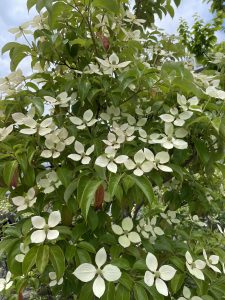 クリニック入り口に2本の↓白い花を咲かせた木があります。ヤマボウシという木です。見たこと聞いたことはありますか?